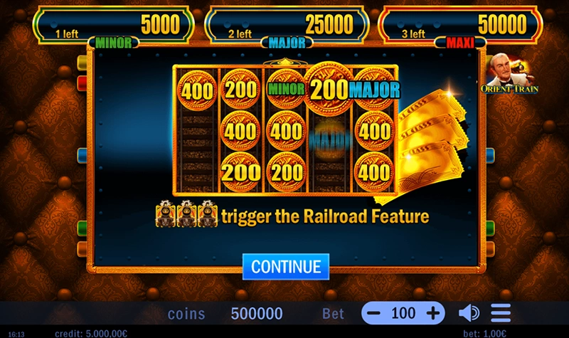 Three trains trigger the popular Railroad feature. In the magic feature, points and prizes (Minor, Major, Maxi) are collected.