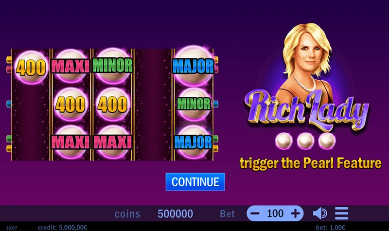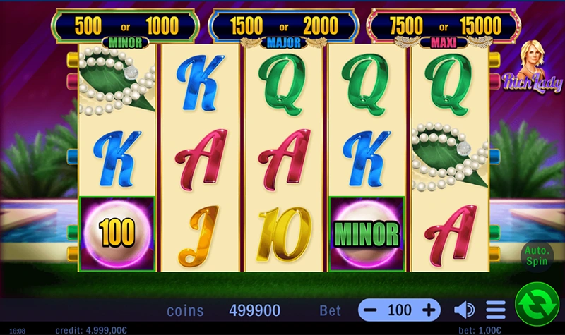 The Rich Lady herself appears as a wild, completing winning lines and adding glamour to the grid.