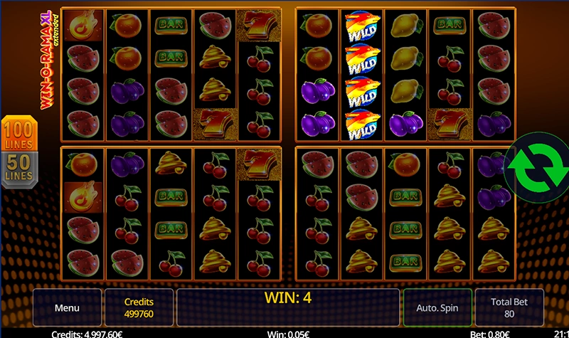 Guaranteed fruit game fun with up to 100 paylines, two different scatters AND 4 fields to play on simultaneously. As usual, you can choose between 50 or 100 paylines to win even bigger prizes. The spreading WILD helps you to do this. In addition to the paylines, there is another highlight. The game is played on a total of 4 fields at the same time!